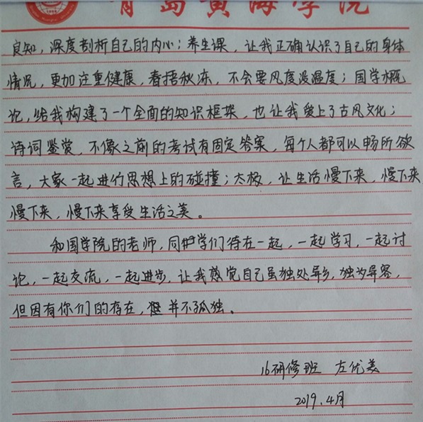 参加座谈16级研修班的王勇同学谈到:“在国学院的学习过程就像是一种享受,在《论语》中学习为人处世,立己立人,何乐而不为呢?记得初到国学院时,学姐带我每日晨读经典,日日去,日日都有收获,放空心,读经典,身心备受滋养。国学让我明白,无论身在何处,都要发挥正能量,发光发热,日益优秀;国学让我找到初心,对万事万物真心以待,不浮躁,懂得坚持方得始终。”