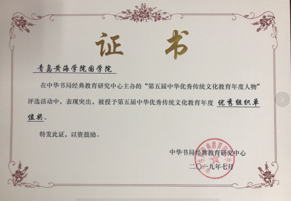 我校国学院荣获第五届中华优秀传统文化教育年度人物评选 “优秀组织单位奖” 获奖证书