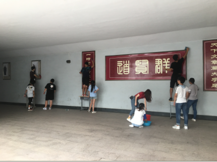 一周前,2017级国学研修班的同学们便在班会中决定抽出周末时间擦拭隧道中的七十二贤像。此刻,他们自发约定、汇聚于此,搬来桌椅,认真细致地为七十二贤像抹去灰尘,明亮镜像。他们拂去的何止岁月的灰尘?比镜像更明亮的,是先贤的光辉和大家心中的良知。