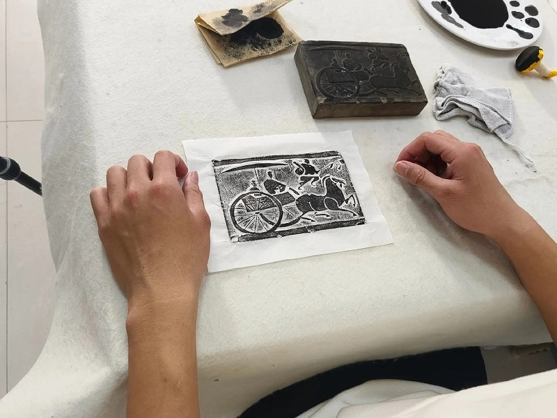 经过理论知识的浸润之后,同学们迫不及待地开始了传拓的实践。同学们积极尝试,巩老师悉心指导,氛围很是融洽。随着拓包在宣纸上一遍遍行走,一个个精美图案跃然纸上。