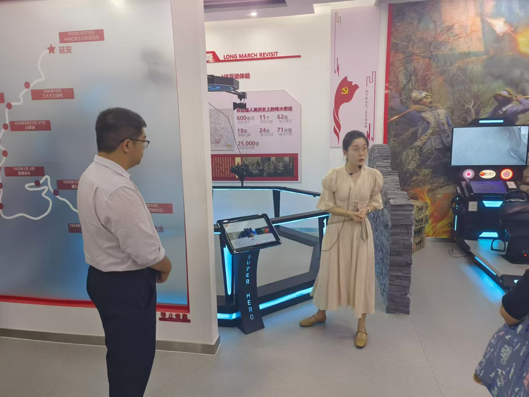 紧接着,大家来到了新时代红色文化实践教育基地感受红色文化。进入之后,强烈的红色文化氛围扑面而来。红色文化 VR 交互体验馆中,先进的 VR 行走平台、智能知识抢答平台等设备,让人们仿佛置身于革命年代。通过沉浸式虚拟现实技术,大家亲身感受了红色战争场景,更加深切地感悟到党的艰辛历程和革命先辈们的伟大精神。新时代红色文化实践教育基地,是红色文化铸魂育人的重要场所,它将红色文化与现代科技相结合,为大家提供了一个全新的学习和体验平台。
