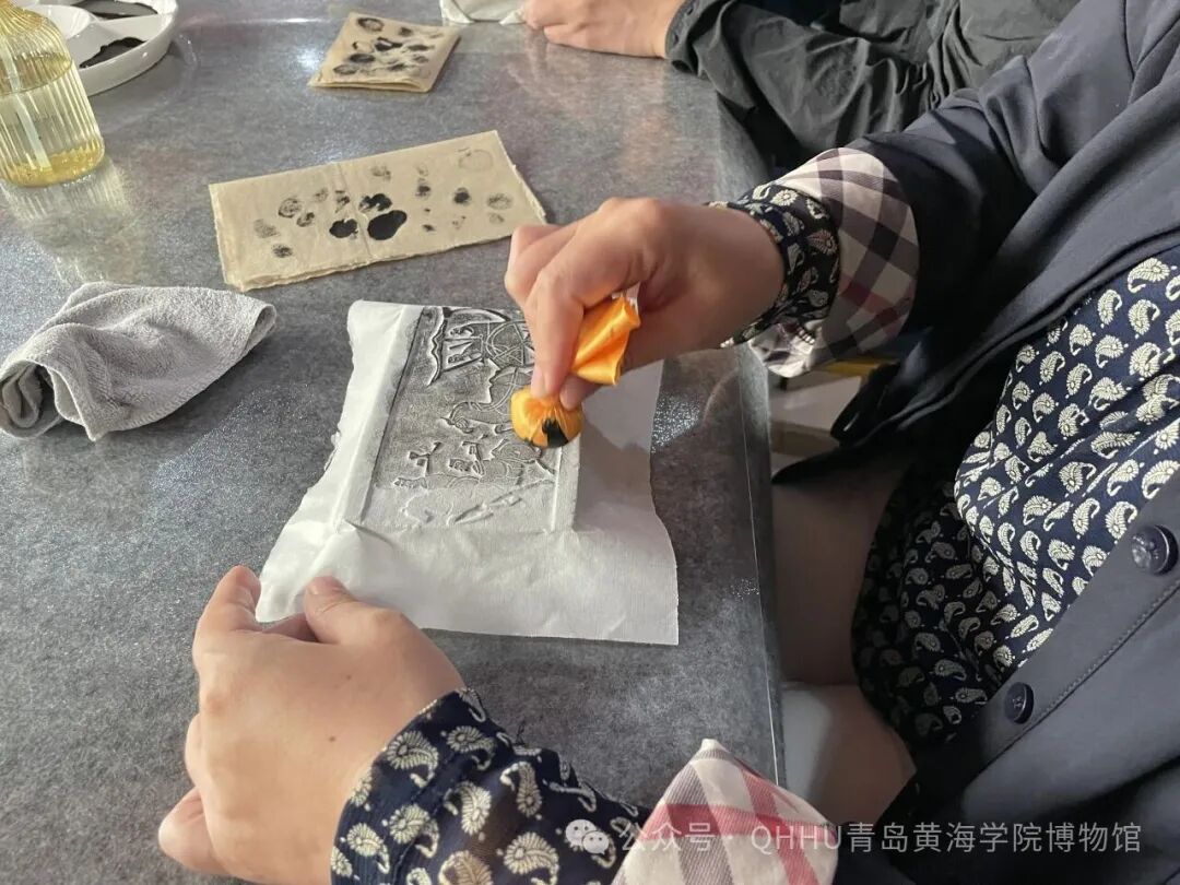 随后的传拓体验环节,传拓老师手把手教学:铺纸要平整、喷水要适度、捶打要轻匀、上墨要细腻。会员们围坐桌前,小心翼翼地操作,看着器物上的纹理在纸上逐渐清晰,成就感满满。