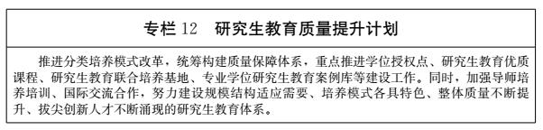 推进研究生分类培养。加强研究生创新创业能力、现代信息技术、科学与人文精神、全球思维的培养。学术学位研究生突出学术素养和创新能力素养,专业学位研究生突出职业能力和实践能力培养,使学术型与专业学位教育协调发展、特色鲜明、各成体系。加大研究生教育创新计划支持力度,实施研究生教育质量提升计划。