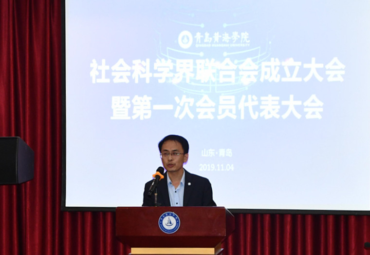 11月4日下午,我校社会科学界联合会成立大会暨第一次会员代表大会在学校知新楼西报告厅召开。山东省社科联党组副书记、副主席周忠高,山东省社科联组联部部长、一级调研员曲艺,山东省社科联组联部一级主任科员卢文娟,青岛市社科联党组成员、副主席杨华新,青岛市社科联学会部部长肖建来,我校校长王渊明,副校长梁忠环,纪委书记、校长助理马永来,党委委员、校长助理孟广东,党委委员、校长助理焦立涛及部分师生代表共计244人出席会议,会议由纪委书记、校长助理马永来主持。