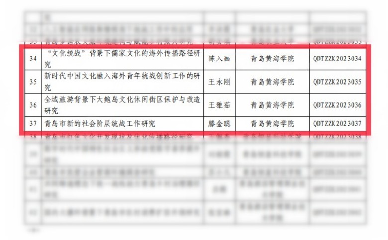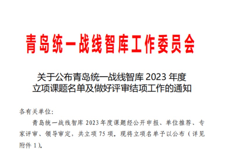 7月14日,青岛统一战线智库委员会下发了《关于公布青岛统一战线智库2023年度立项课题名单及做好评审结项工作的通知》,我校4项课题获批立项。