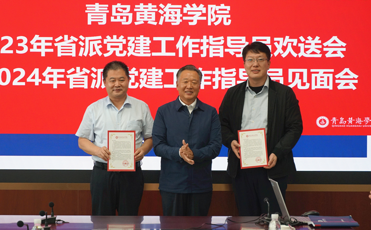 李东书记代表学校向山东中医药大学、青岛大学两所派出高校颁发感谢信,为郭芳伶、王伟同志颁发荣誉党建指导员聘书。