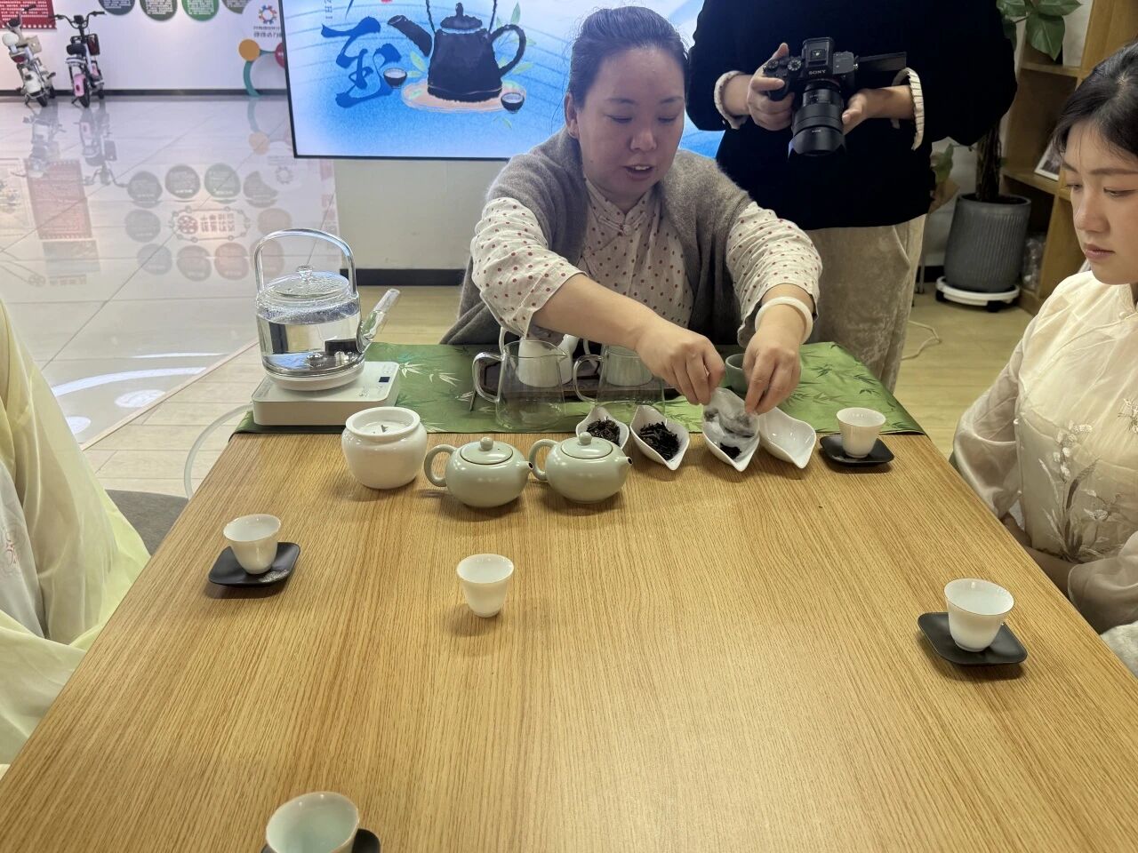 品茗交流环节更是暖意浓浓。志愿者们端着茶盘,把泡好的茶汤送到居民手中,白瓷茶杯里,红茶的茶汤红亮温润,乌龙茶的茶汤清澈回甘。居民们围坐在一起,喝着茶打开了话匣子:张奶奶说起小时候跟着外婆喝茉莉花茶的往事,李叔叔分享自己出差时在福建喝岩茶的经历,志愿者们听得入神,还时不时插上几句,和居民探讨茶与中医养生的搭配。