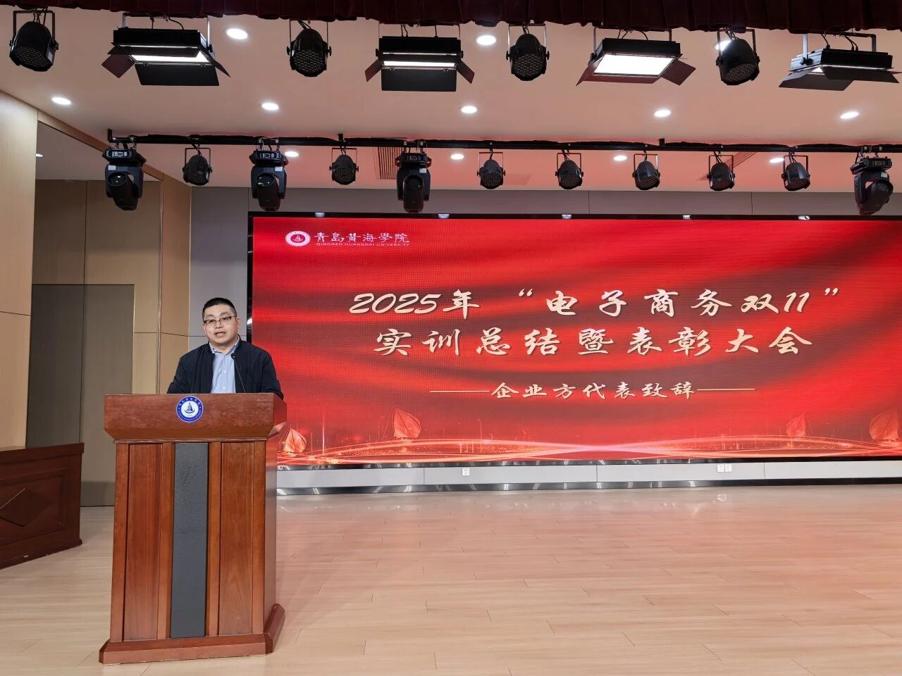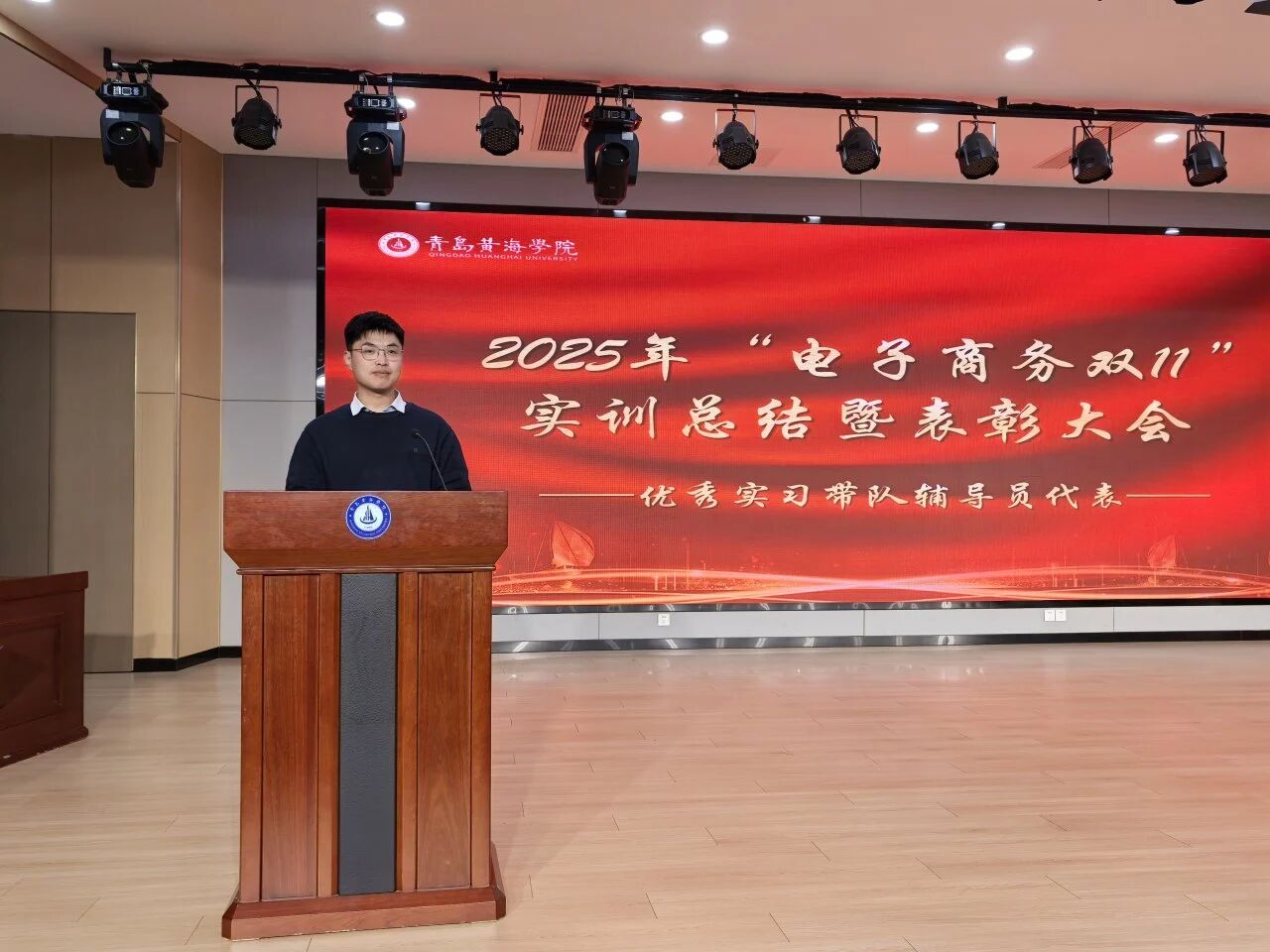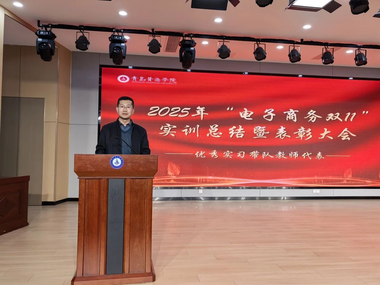 紧接着,优秀指导教师代表陈修龙上台发言。他聚焦实训过程中的教学协同与岗位适配,分享了校企双方共同制定实训方案、细化教学目标的实践经验,肯定了同学们在岗位上主动钻研、攻坚克难的良好风貌。他寄语同学们要以实训为起点,持续深化理论与实践的结合,在电商行业的赛道上找准定位、稳步前行。