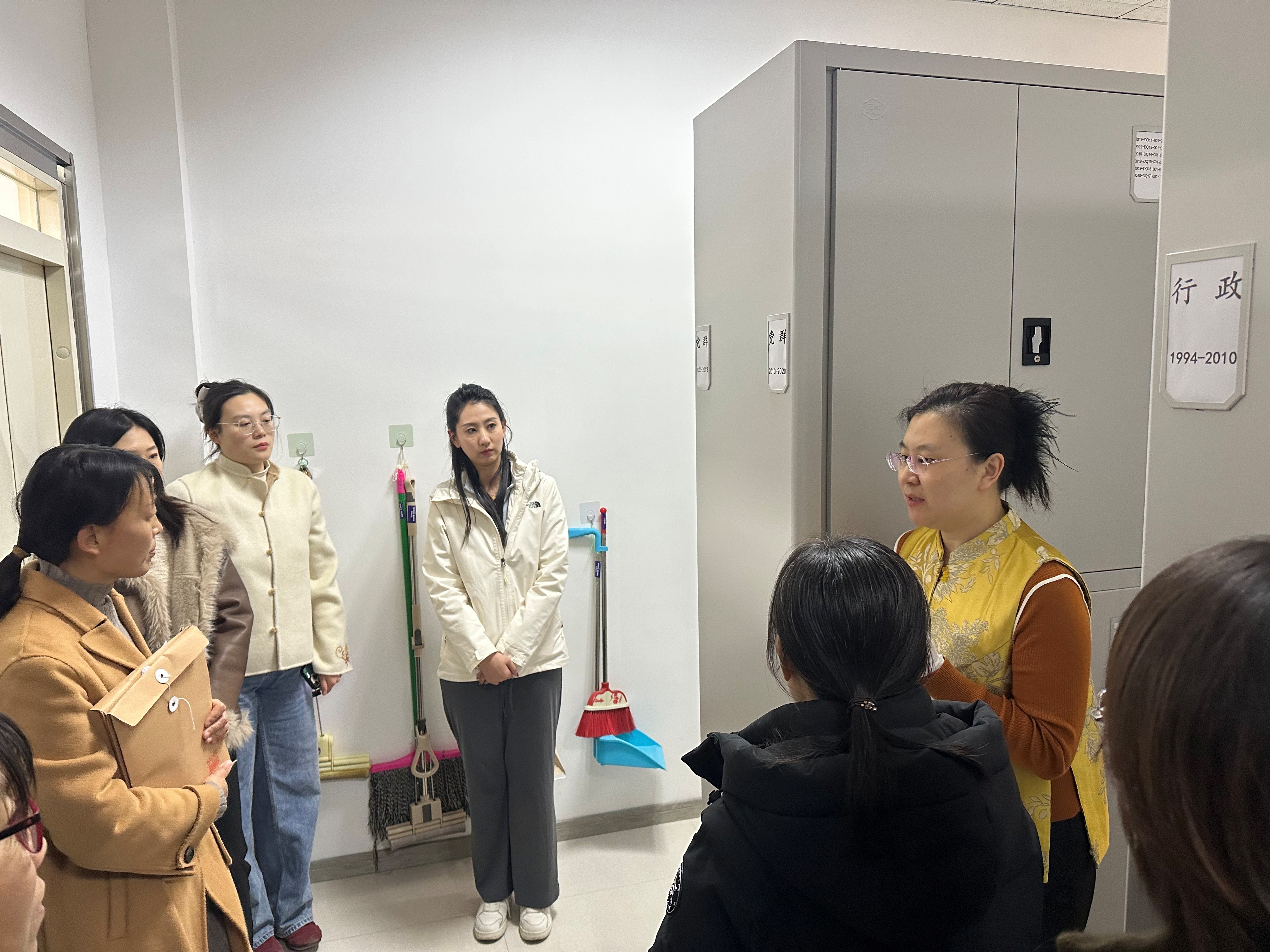 学习现场,董晖老师首先带领大家参观档案库房,结合实际归档案例,逐一对行政、党建档案的收集内容、组卷要求、成卷规范进行详细讲解,明确了“一事一卷”组卷原则、档案材料排序标准等关键要点。针对2026年学校建校30周年这一重要工作,董晖老师重点部署校庆档案相关工作,要求学院围绕校庆期间校友来访、展览、节目表演等各类活动,严格按照规范做好材料收集,校庆结束后一周内完成组卷上交,确保校庆档案完整留存。讲解结束后,学院老师们认真翻阅已归档的行政、党建档案,对照规范梳理疑问、交流心得,切实掌握实操要点。