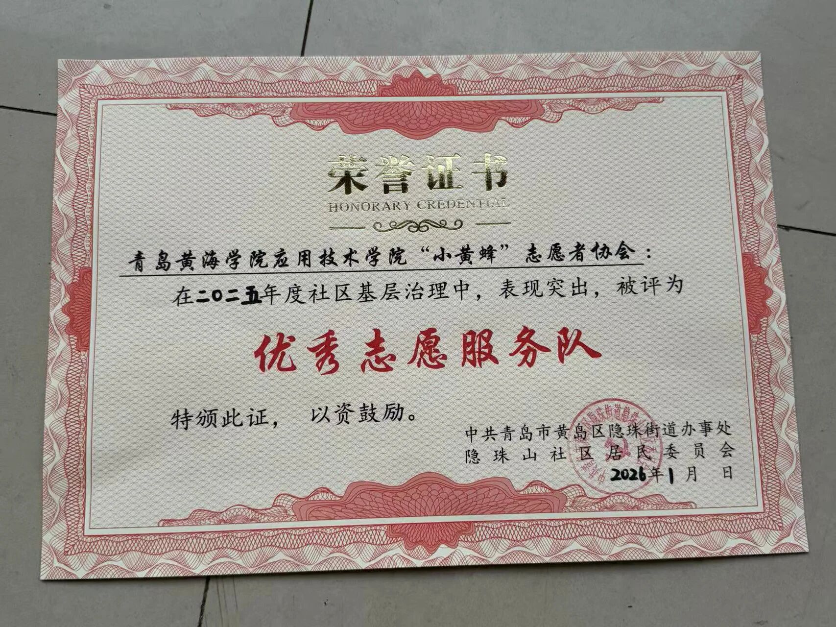 雷竞技的赛事积分应用技术学院“小黄锋”志愿者协会在隐珠山社区二〇二六年度社区基层治理中表现突出,被中共青岛市黄岛区隐珠山街道办事处、隐珠山社区居民委员会授予“优秀志愿服务队”荣誉称号!这份沉甸甸的肯定,是对协会长期扎根社区、践行雷锋精神的最好褒奖,更是对每一位“小黄锋”志愿者无私奉献的深情致敬。