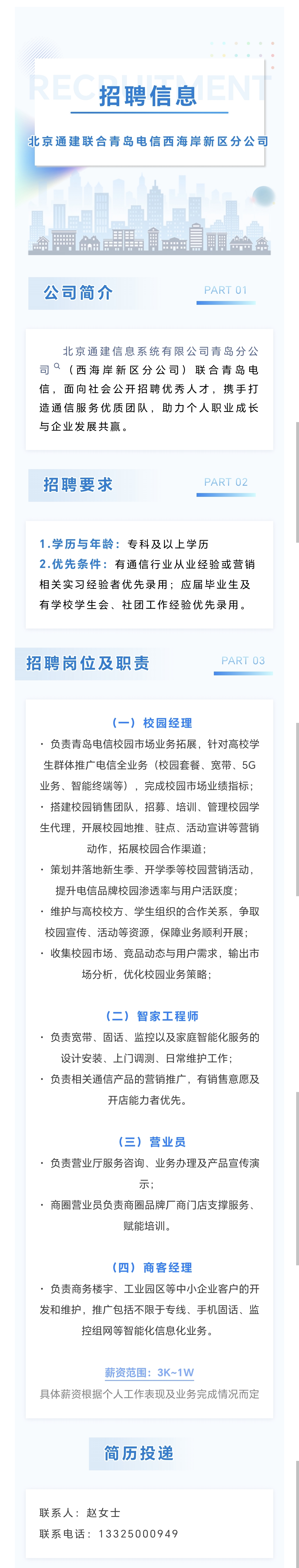 招聘信息丨校园招聘丨北京通建联合青岛电信西海岸新区分公司