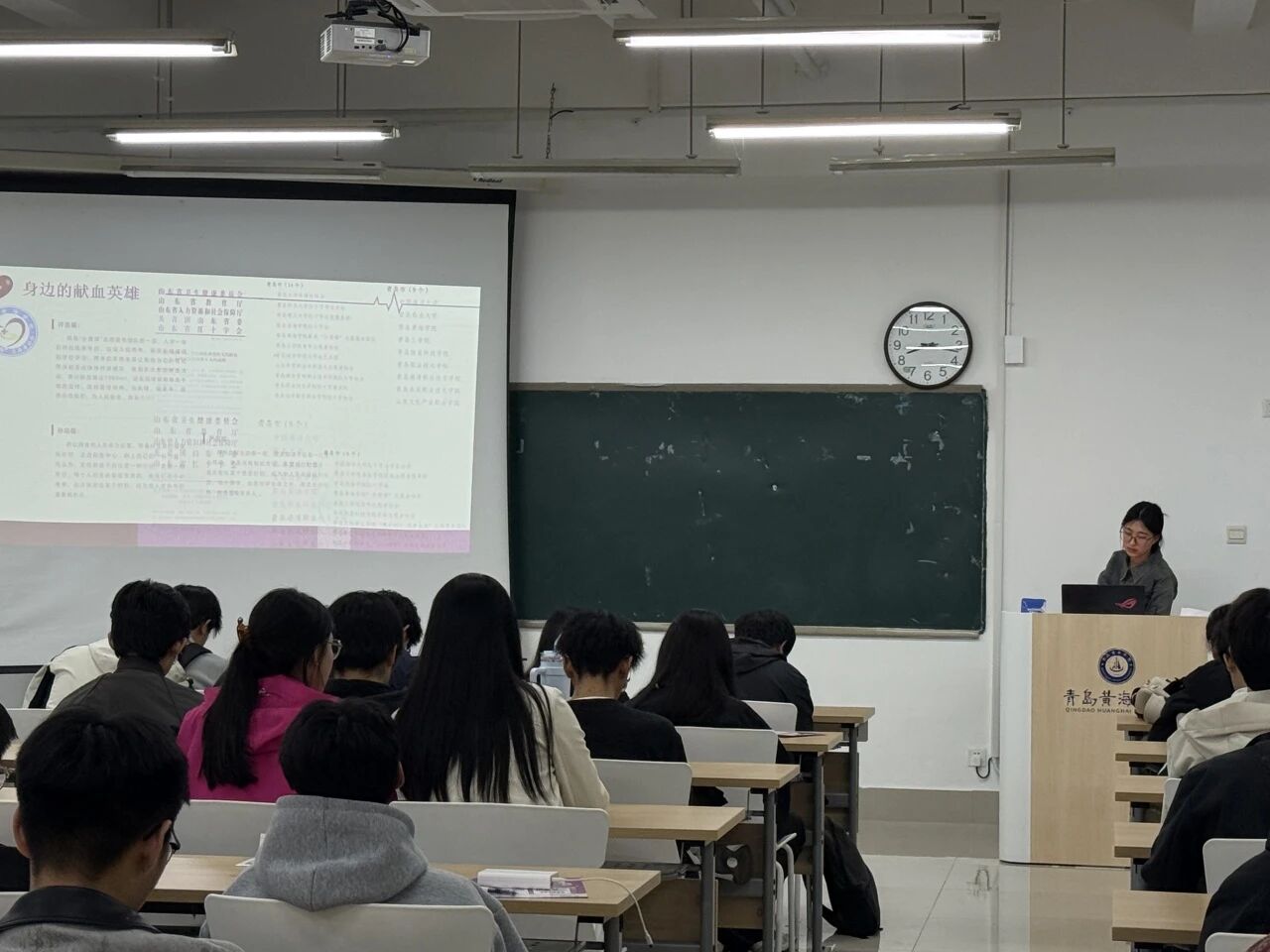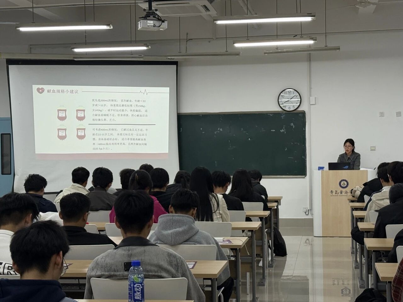 讲现场,宣讲团围绕着同学们最关心的问题展开细致讲解:在献血要求上,明确了18-55周岁(最高可延至60周岁)、体重达标、血压脉搏正常等基础条件,同时针对不同人群给出200ml或400ml的献血规格建议,让同学们清晰了解自身是否符合献血标准;在注意事项上,系统梳理了献血前清淡饮食、保证睡眠,献血后按压止血、避免剧烈运动等关键要点,更详细科普了献血后身体的自我调节机制,用科学数据打破“献血伤元气”的误区。针对大众普遍存在的认知误区,宣讲团逐一进行科学辟谣:“献血会伤身体?”——健康成人一次献血200-400ml仅占全身血量的5%-10%,身体会在数小时内恢复血容量,1-2周内补充完所有血液成分,反而能促进血液循环、降低心血管疾病风险;“献血会感染传染病?”——正规采血点全程使用一次性无菌耗材,严格执行无菌操作,感染风险为零。