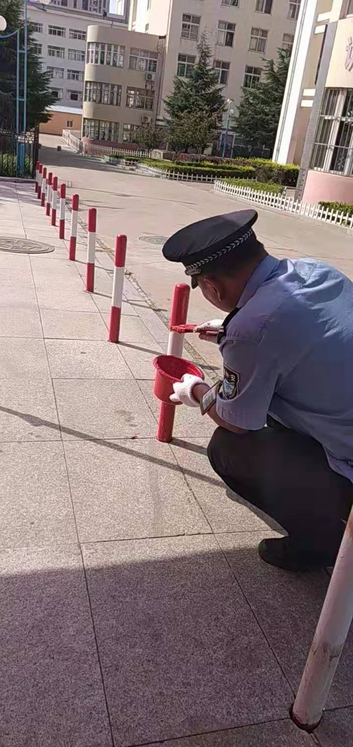 8月23日上午,保卫处安监科对珠山职校大门外及文苑餐厅周边隔离石墩进行粉刷,为学校迎新做好准备。