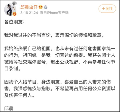 据悉,近日《奇葩说》辩手邱晨昔日疑参与的“占中”的活动海报设计一事曝光,引起了全网友的热议。随后,又有网友“扒”出了邱晨几年前在社交平台上疑似支持“港独”言论。