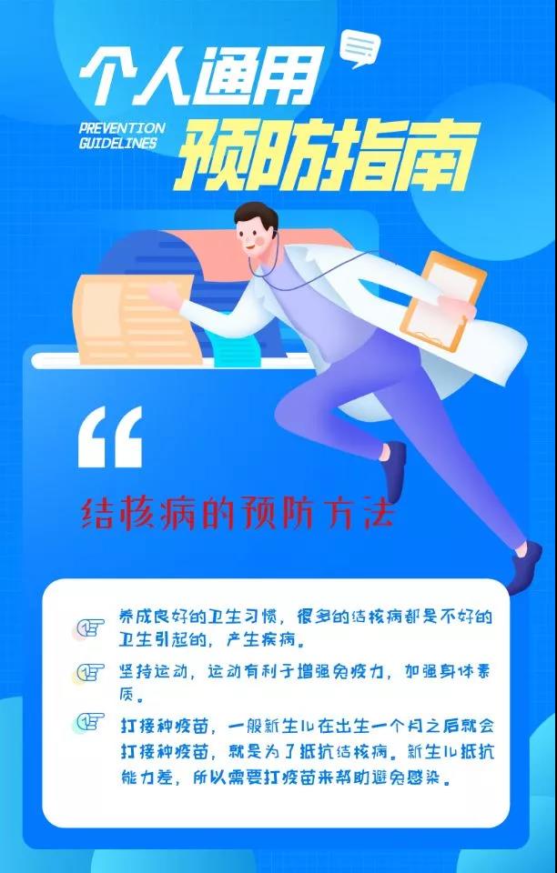 知道了什么是肺结核,那我们就应该了解怎样预防肺结核。我们-平时也应做到:1、控制传染源。也就是说,没有受到结核菌感染的人即出生时接种卡介苗,七岁时再接种一次。这样,可增强身体免疫力。对于已经感染结核菌的人应该用抗结核药物进行预防,这样才能降低发病率。2、 定时进行体格检查。如果家人或自己患了肺结核,坚决做到隔离治疗。3平时要养成不随地吐痰、不乱倒垃圾、扫地先洒水等良好的卫生习惯。3、加强营养、多食高热量、高蛋白、富含维生素饮食。如牛奶、鸡蛋、鱼、瘦肉、新鲜蔬菜、水果等,增强抵抗力。4 、坚强体育锻炼,以锻炼肺活量,如散步、做操等。5、 尽量少去公共场所,根据天气变化增减衣物,积极预防感冒,以免抵抗力低下而染病。6、 要养成良好的生活习惯,规律作息,戒烟限酒,保持良好的心态,乐观的情绪均有利于防病。