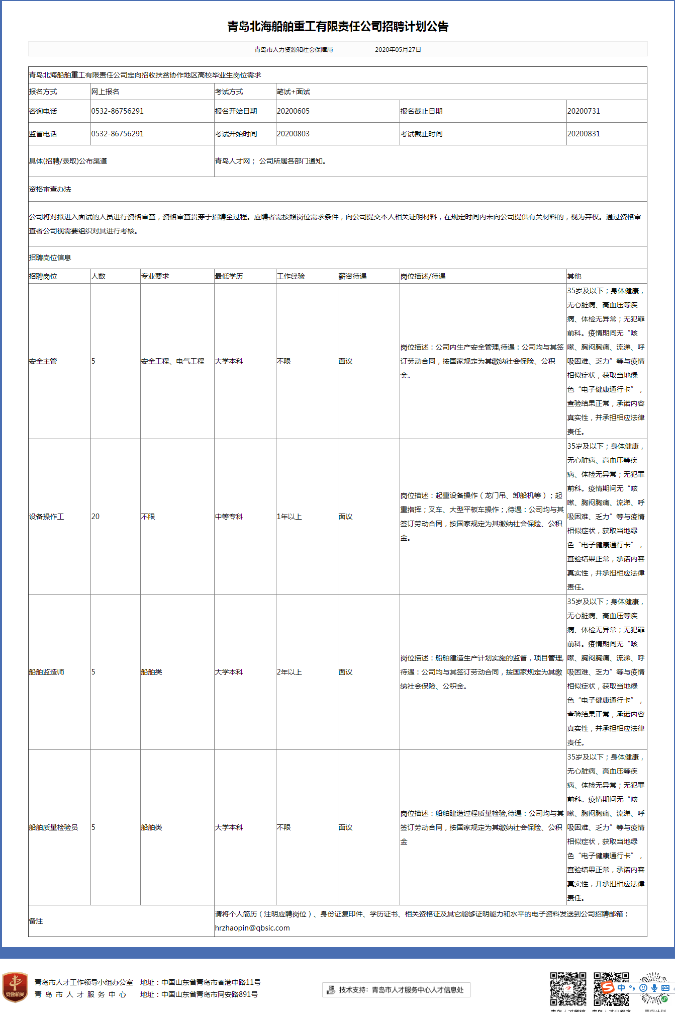 青岛北海船舶重工有限责任公司招聘计划公告
