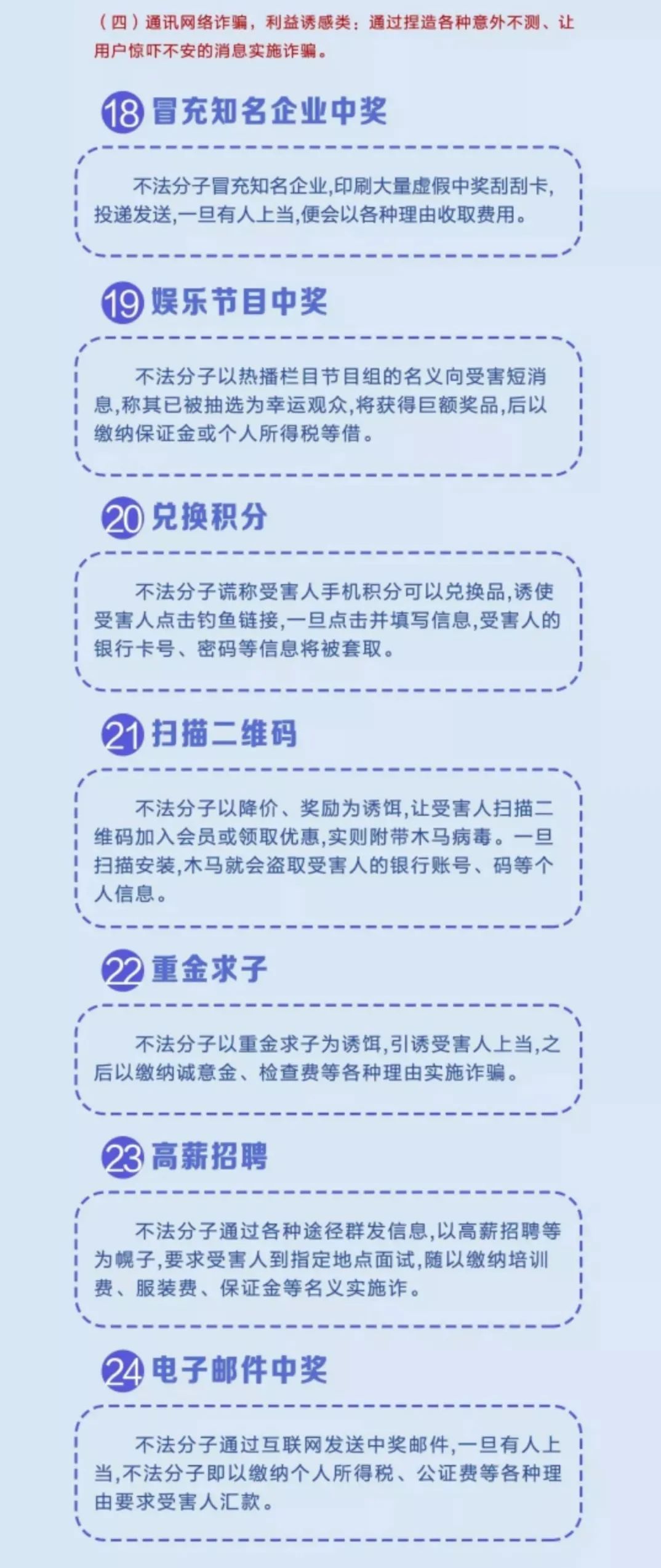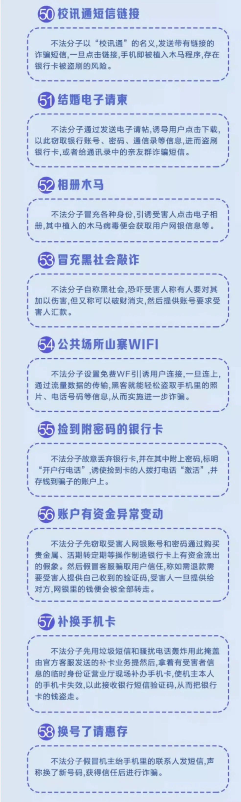 不要听信陌生人的花言巧语,贪图优惠和方便,办理业务要到正规的营业厅。同学们切勿贪小便宜,遇到上门推销不要轻易购买;化妆品、洗发水、运动鞋或笔记本电脑等物品,骗子极有可能采用伪劣产品或以数量短缺等方式进行诈骗。防止银行卡诈骗、网上诈骗、电话诈骗,不要相信未经核实的退学费、中奖、捐助等信息、电话,不要贪图小利以免上当受骗。