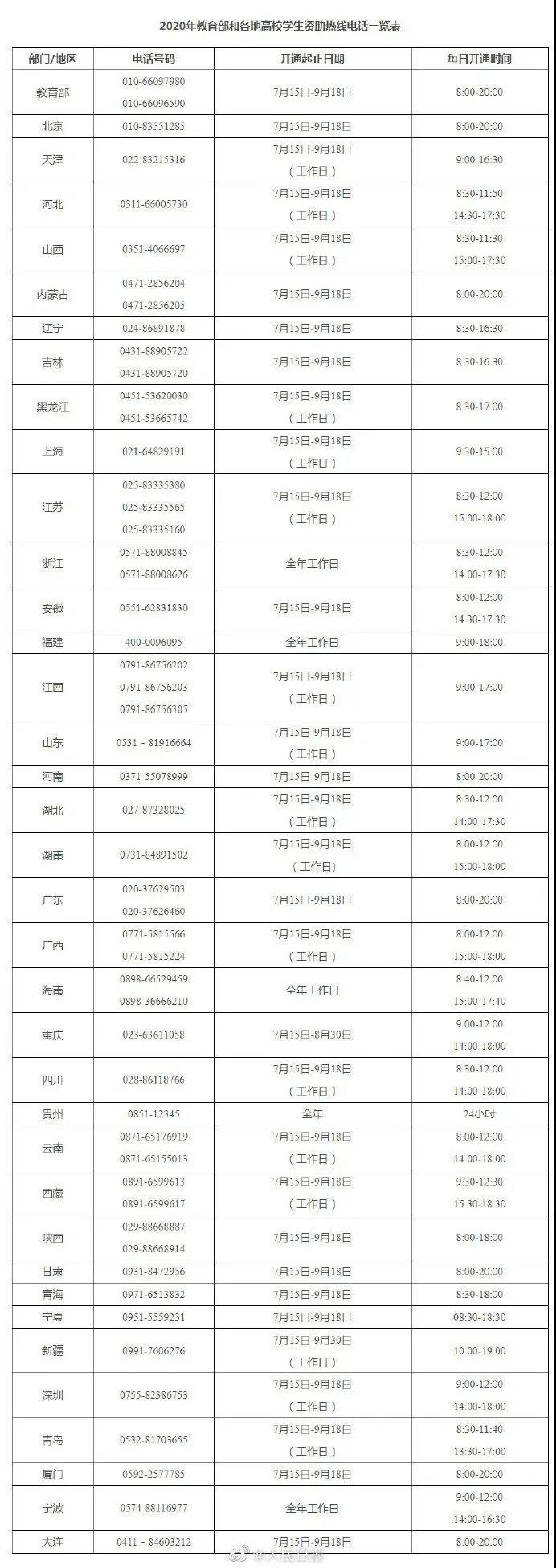 15日,教育部正式开通全国高校学生资助热线电话:010-66097980、010-66096590。受新冠肺炎疫情影响,全社会对学生资助给予了更多的关注。为了更好地服务家庭经济困难学生及家长,解除他们的后顾之忧,2020年,教育部将高校学生资助热线电话受理时间又延长了一周,具体受理时间为7月15日—9月18日(含周六日)早8:00—晚20:00,是历年来开通时间最长的一年。教育部同时要求各省(自治区、直辖市、计划单列市)教育行政部门、各中央高校及地方高校全面开通2020年高校学生资助热线电话。需要特别提醒同学和家长:开学前后是诈骗高发期,同学们一定要擦亮眼睛,提高警惕,抵住诱惑,避免上当受骗。学生与家长如有高校资助方面的问题,可通过以下联系方式进行咨询。