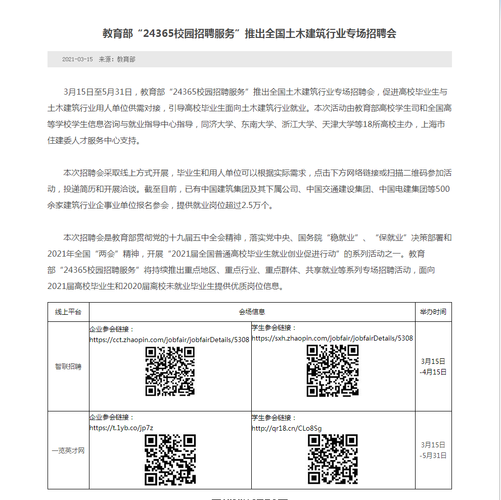 教育部“24365校园招聘服务”推出全国土木建筑行业专场招聘会