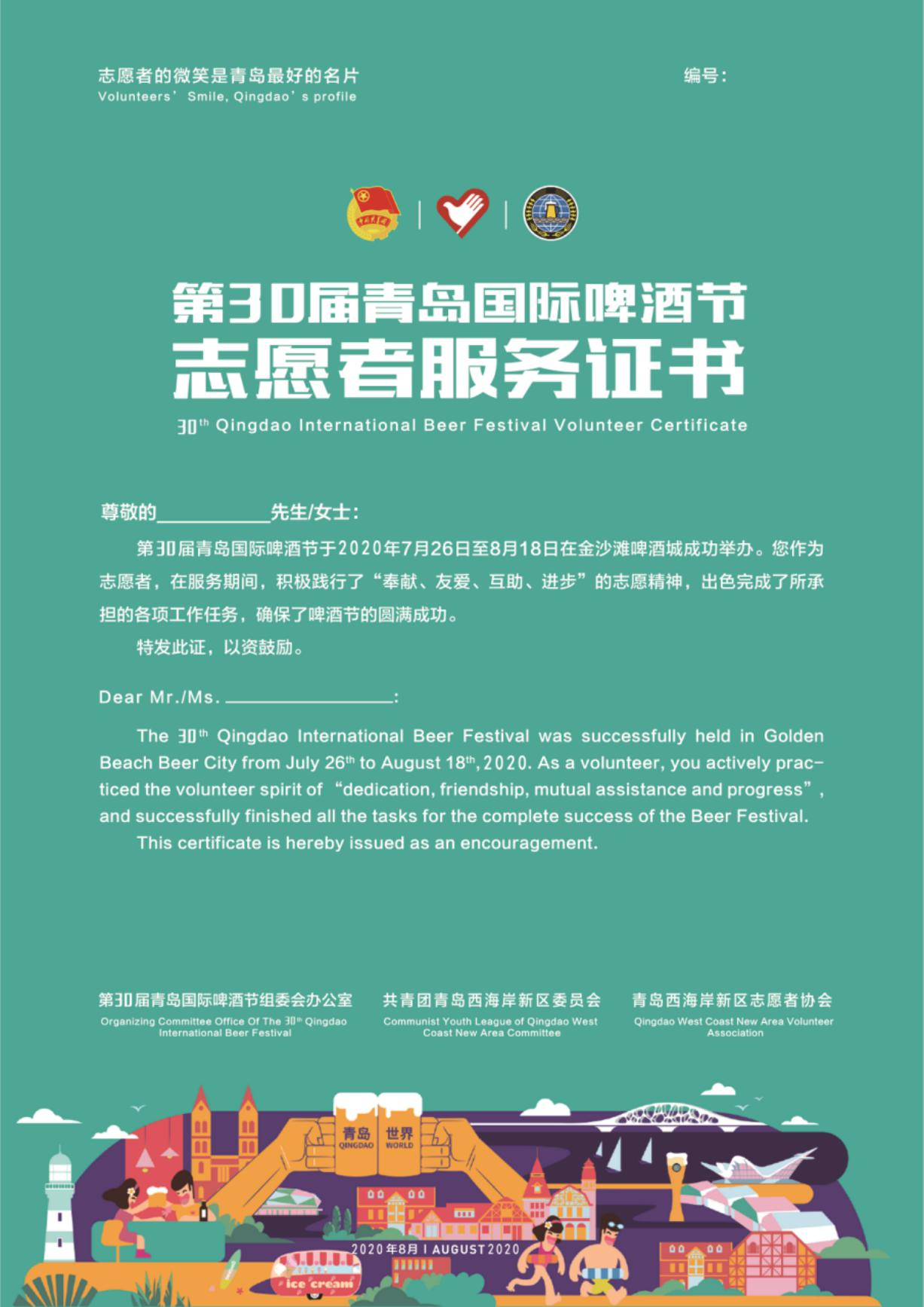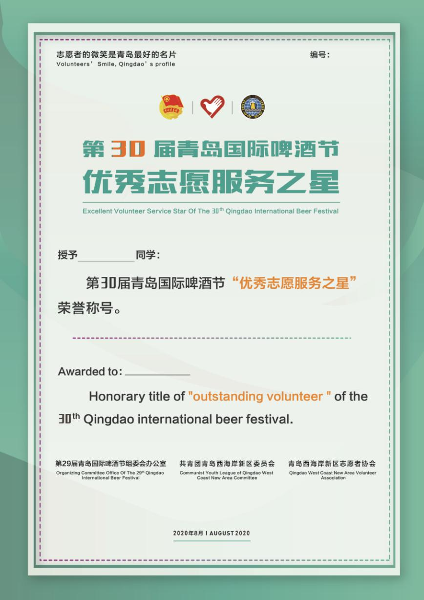 3、第30届青岛国际啤酒节志愿者服务证书(示例)