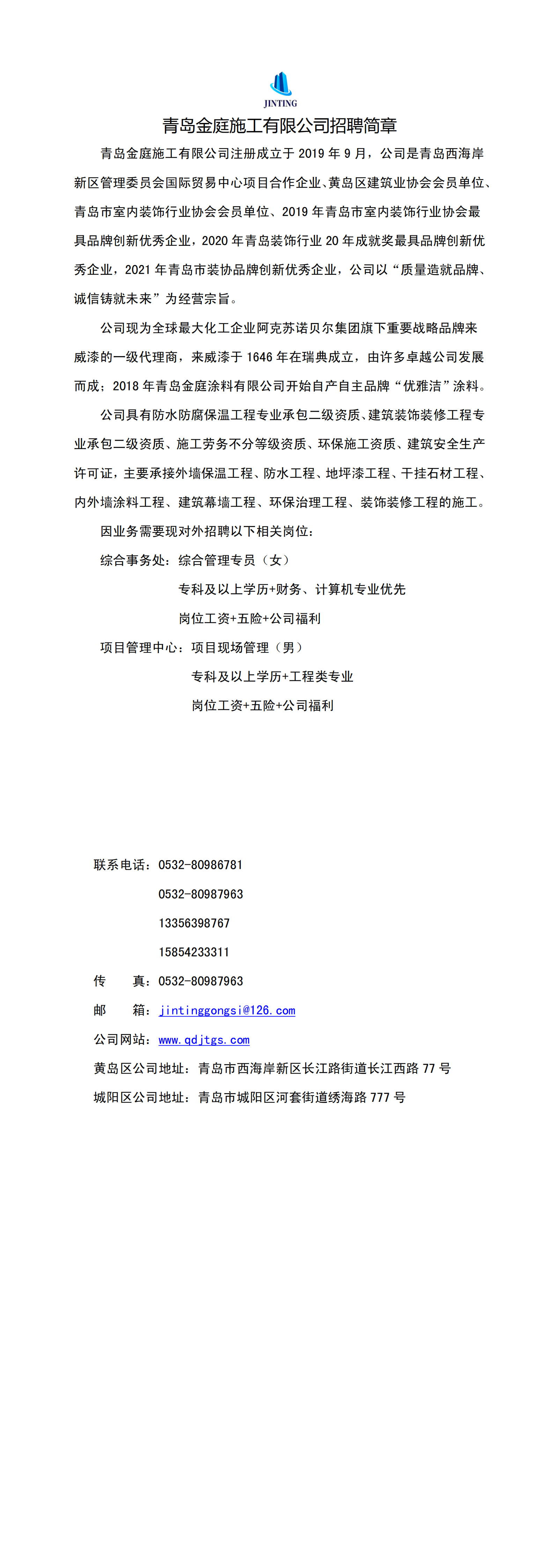 青岛金庭施工有限公司招聘简章下载