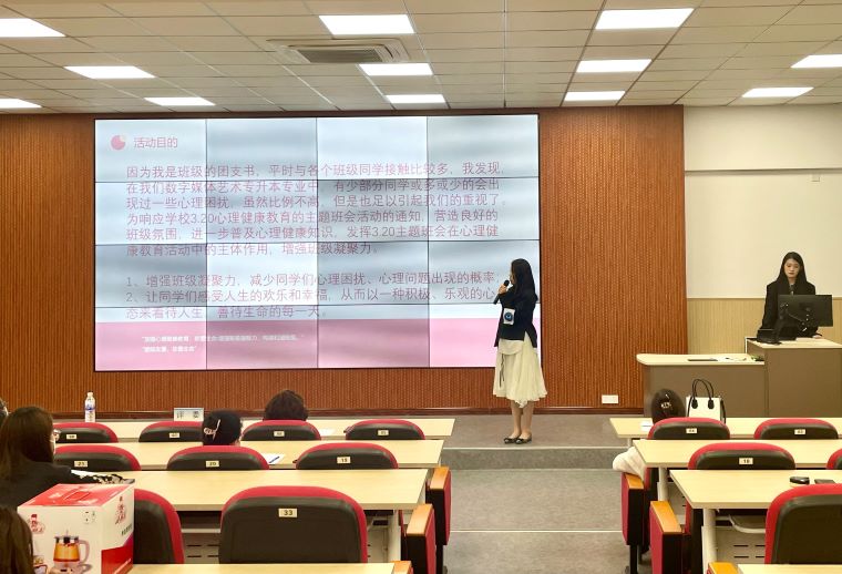 8组选手依次上台答辩,分别围绕着“生命教育”、“恋爱心理”、“情绪管理”、“挫折教育”等主题进行班会主题汇报展演,从前期准备、中期举办、后期宣传、班会总结四个方面介绍了各自班团课的开展情况。参赛选手将积极昂扬的精神展现地淋漓尽致,他们以饱满的热情、清晰的思维以及流畅的表达顺利完成本次比赛。