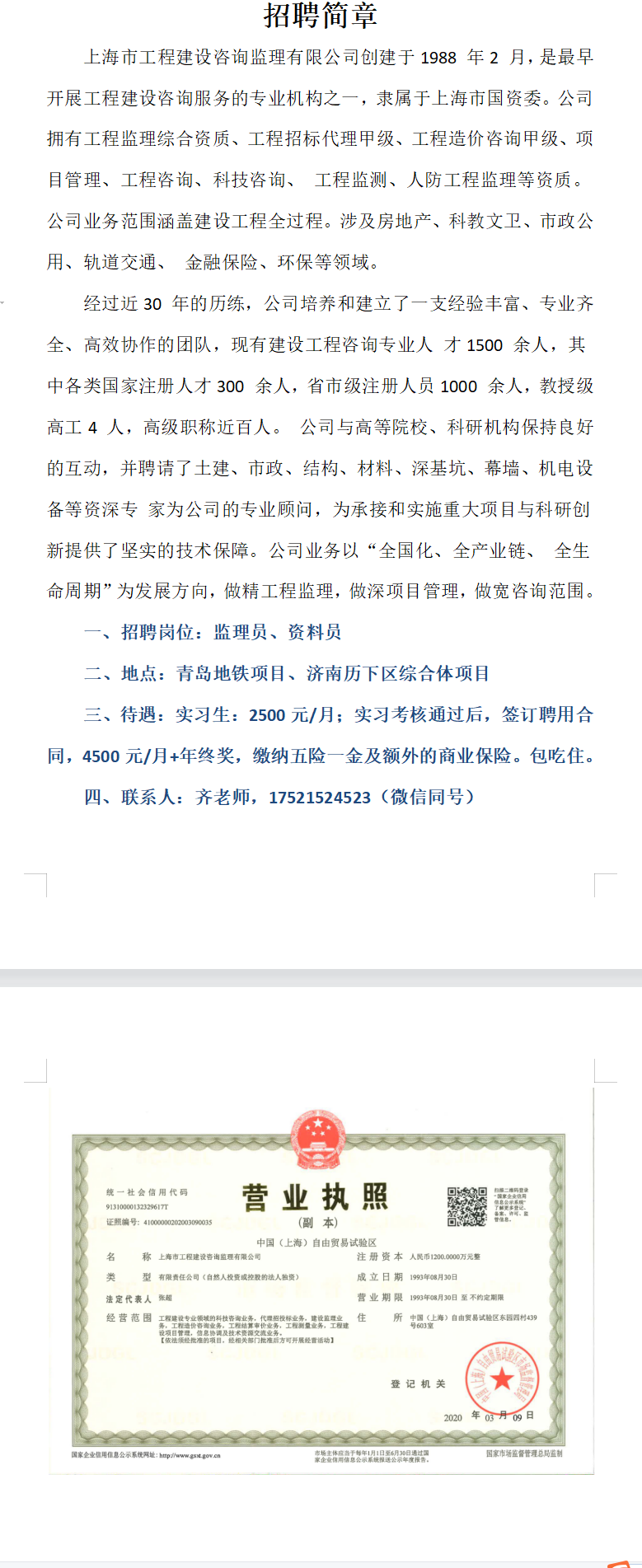 上海市工程建设咨询监理有限公司招聘简章