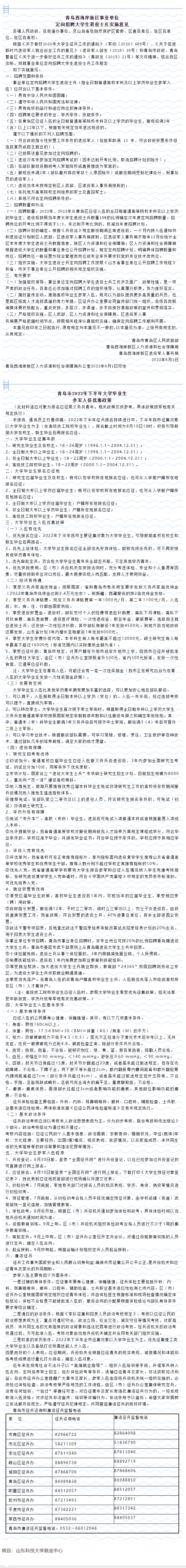 原文链接:【通知公告】丨【重磅!西海岸新区可以带编入伍了,带你全面了解青岛市2022年征兵宣传政策】(山东科技大学就业中心)