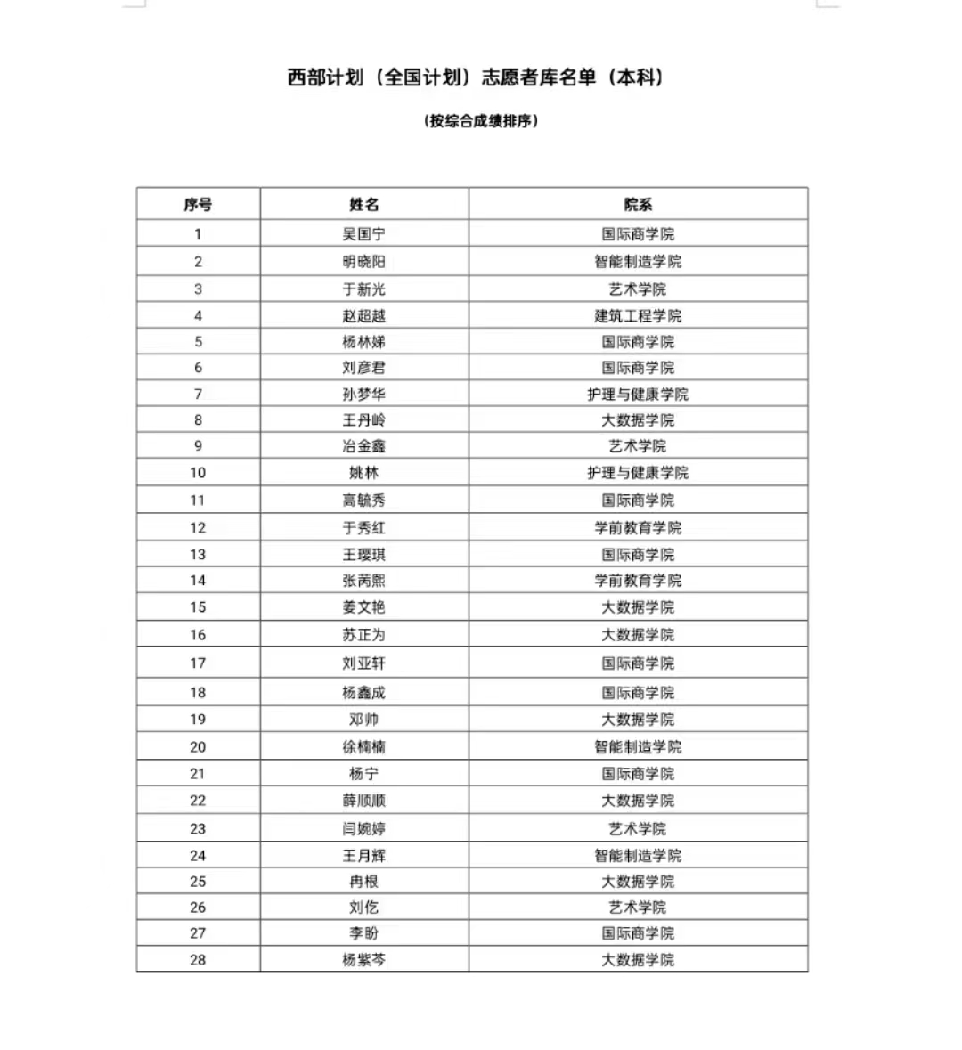 本着"公平、公正、公开"的原则,经前期资格审查,共有49名志愿者候选人进入最终面试环节。学校团委组建西部计划志愿者资格评审小组,根据学生基础条件(占40%)笔试成绩(占30%)面试成绩(占30%),根据总分成绩结果组建西部计划志愿者库。现将名单公示如下。