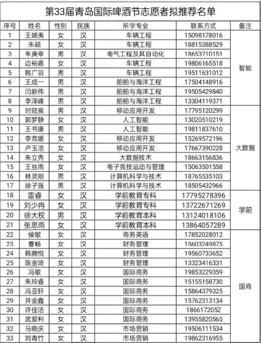 为深入贯彻落实习近平新时代中国特色社会主义思想,全面学习宣传贯彻党的二十大精神,大力弘扬社会主义核心价值观,发挥先进典型示范带动作用,引导和激励黄海广大团员青年在新时代新征程上奋发有为、勇当先锋、昂扬向上,根据《关于协助做好第33届青岛国际啤酒节志愿者招募工作的函》文件要求,经自愿报名、资格审查、学院推荐等环节,对候选人提交的材料进行初步审核,本着"公平、公正、公开"的原则进行面试,第33届青岛国际啤酒节志愿者拟推荐学生33名,从即日起予以公示,公示期3天。