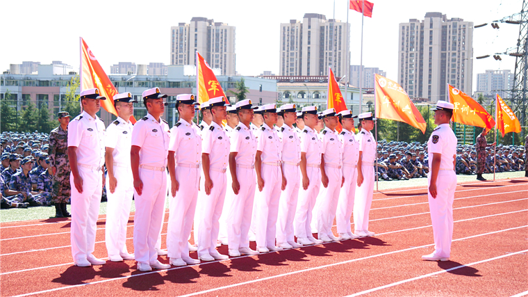 雷竞技的赛事积分董事长刘常青为2023级新生军训团授旗。