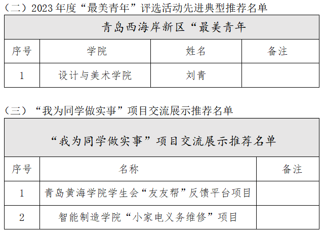 为深入学习宣传党的二十大精神,贯彻落实中央、省、市关于新时代文明实践中心建设工作部署,深入推进新时代文明实践志愿服务,充分彰显文明实践志愿服务的时代价值和道德力量,根据《关于组织开展2023年度新时代文明实践志愿服务先进典型评选活动的通知》《关于印发青岛西海岸新区2023年度“最美青年”评选活动实施方案的通知》《共青团中央办公厅 全国学联秘书处关于开展全国高校学生会组织 “我为同学做实事冶项目交流展示活动的通知》文件要求,学院递交的佐证材料进行严格审核,学校成立评审小组对候选人材料进行评审、投票。现将拟推荐名单予以公示,从即日起予以公示,公示期3天。