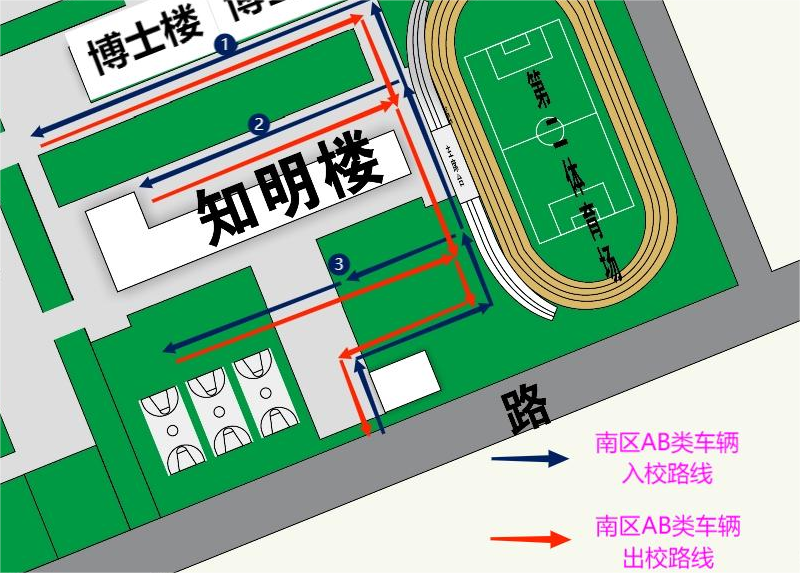 南校区 A、B 类机动车通行路线:从知明楼南大门入校,入校后有 3 条通行路线: