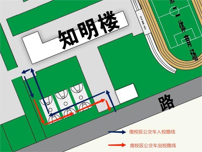 南校区校园公交车路线: 由知明楼前大门入校-左转至广场南侧道路-广场西侧道路-调头停放在广场西侧道路停车点-出校。