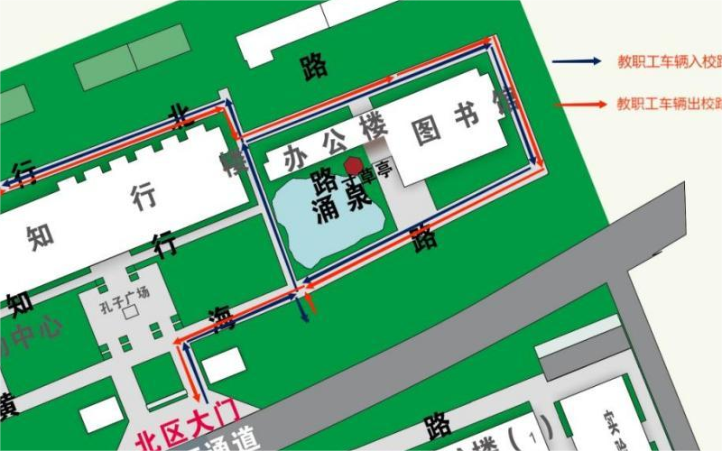 通行路线:该类车由北校区南门入校后右拐进入黄海路,可到黄海路南侧停车场停放,也可以左拐进入喷泉西侧道路,至知 行楼东侧交叉路口时可分为两路:一路右转进入行政楼北侧道路 -图书馆东侧道路-黄海路-北校区南门出校,该路段道路两侧划 定的停车位内可停放车辆。一路左转进入知行北路,可通行至体 育馆北侧停车场,也可停放至道路两侧划定的停车位内,出校时 需沿知行北路-行政楼北侧道路-图书馆东侧道路-黄海路-北校区南门出校。所有车辆外出沿顺时针方向运行。