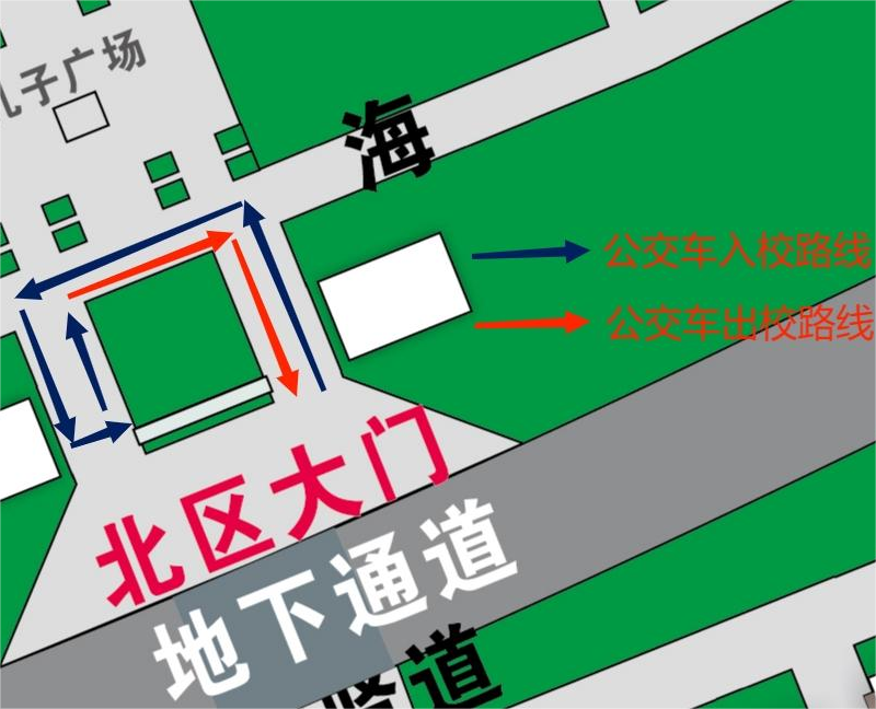 北校区公交车原路线不变,从北校区南门入校后左转,在校门西侧位置调头, 出校。