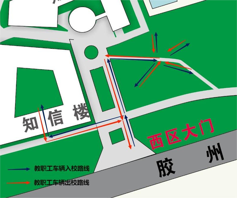 (二)校内教职工车辆原则上只允许上下班时在校内规定道 路上进出校门,其他时间不得在校园内行驶,由于工作原因需要跨校区通行的车辆需走校外道路。