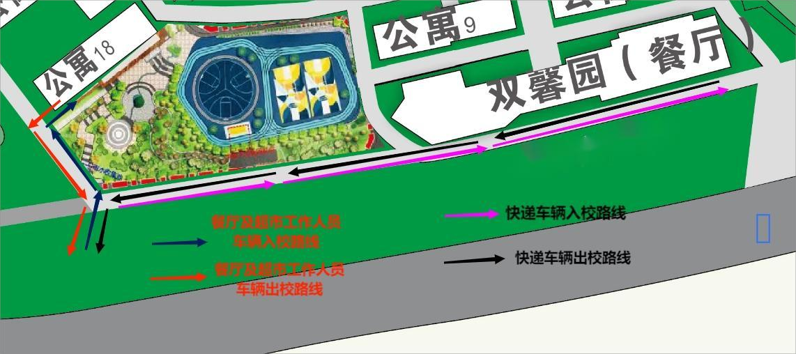 该类车辆需在 10 点-11 点、16 点-17 点时间段内由 18#公寓 楼西南角处大门入校,沿双馨园餐厅南侧道路直行至快递点,再沿原路出校。