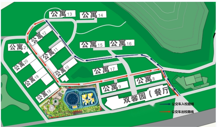 西校区公交车需从双馨园餐厅前大门入校,进入西区生活区,出校时由双馨园餐厅前大门处出校。