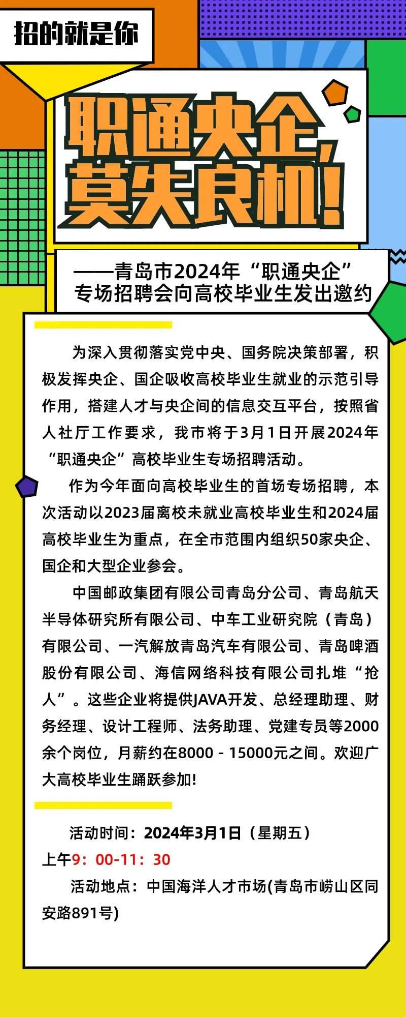 青岛人社发布:职通央企,莫失良机!——青岛市2024年“职通央企”专场招聘会来啦!