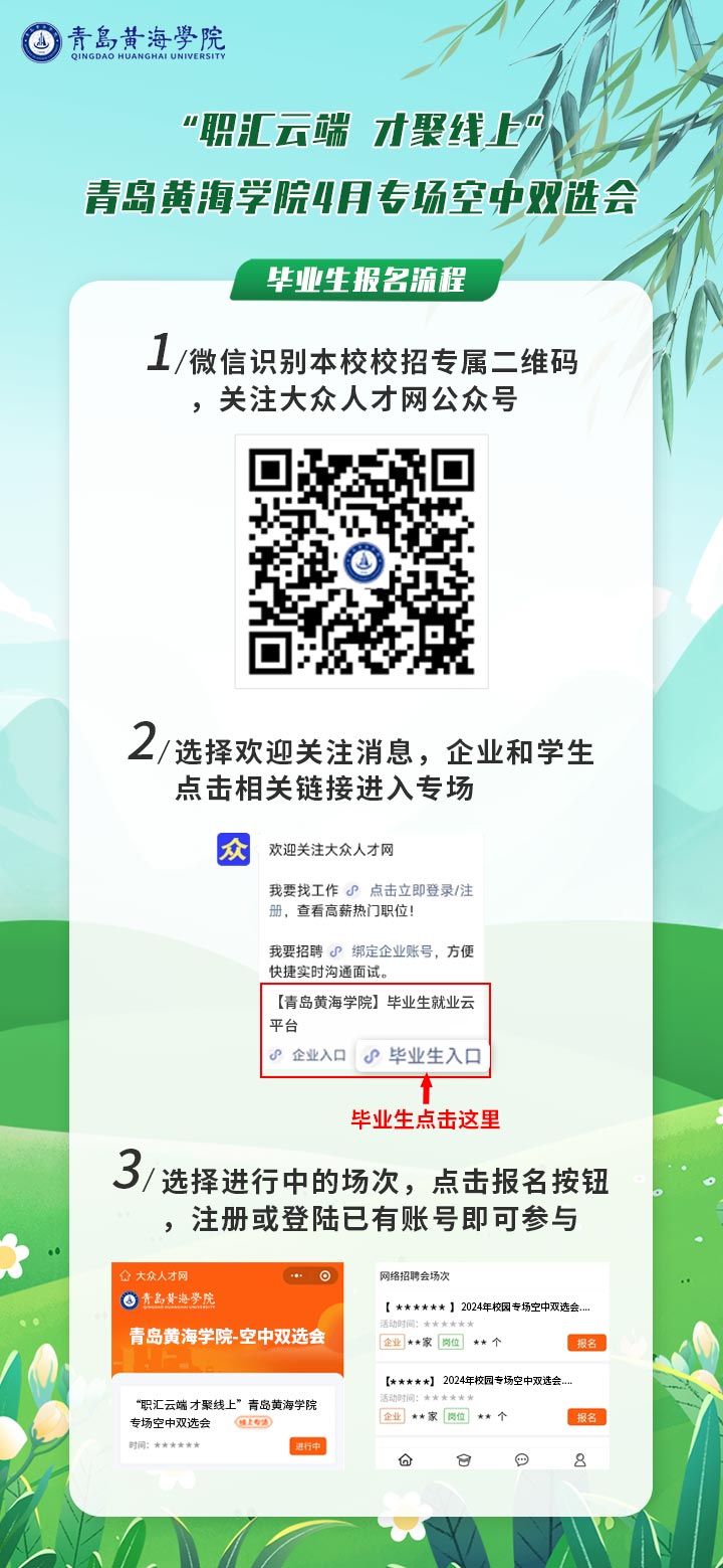 手机微信扫码关注“大众人才网”微信公众号,企业和毕业生点击相关按钮进入雷竞技的赛事积分校招端口,点击报名按钮,注册或登录已有账号即可参与。