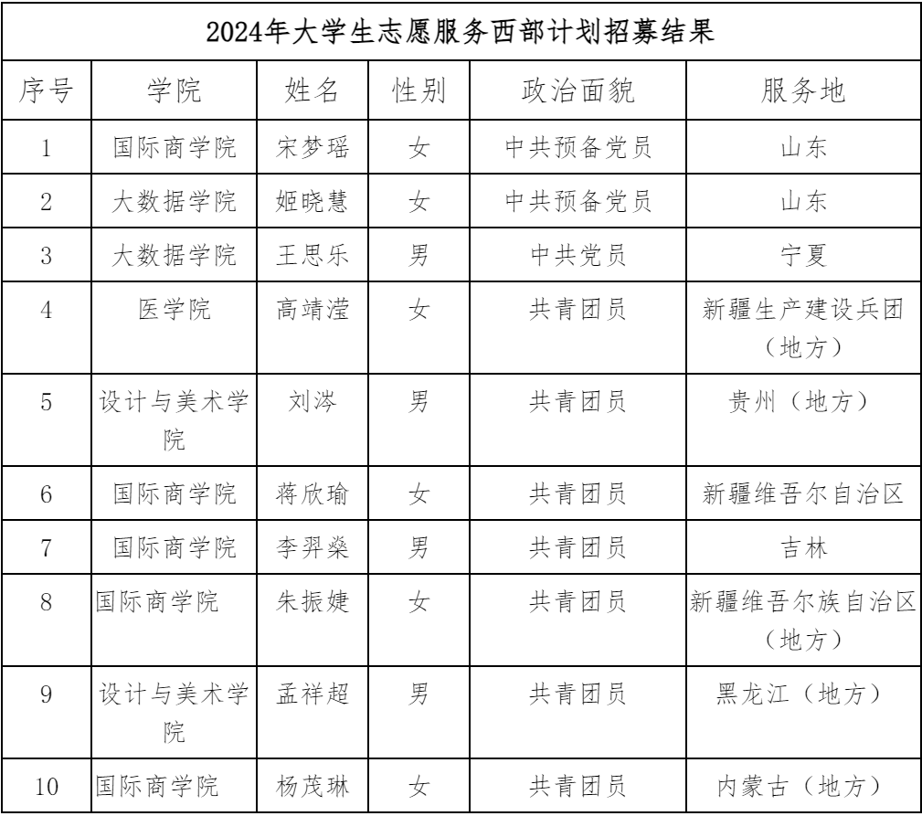 根据《关于做好2024—2025年度西部计划志愿者招募派遣及山东计划相关工作的通知》,经学生自愿报名、学院审核推荐、学校团委组织考试(笔试、面试)考察并结合体检结果,现将我校 2024年大学生志愿服务西部计划招募结果予以公示,公示期5个工作日。