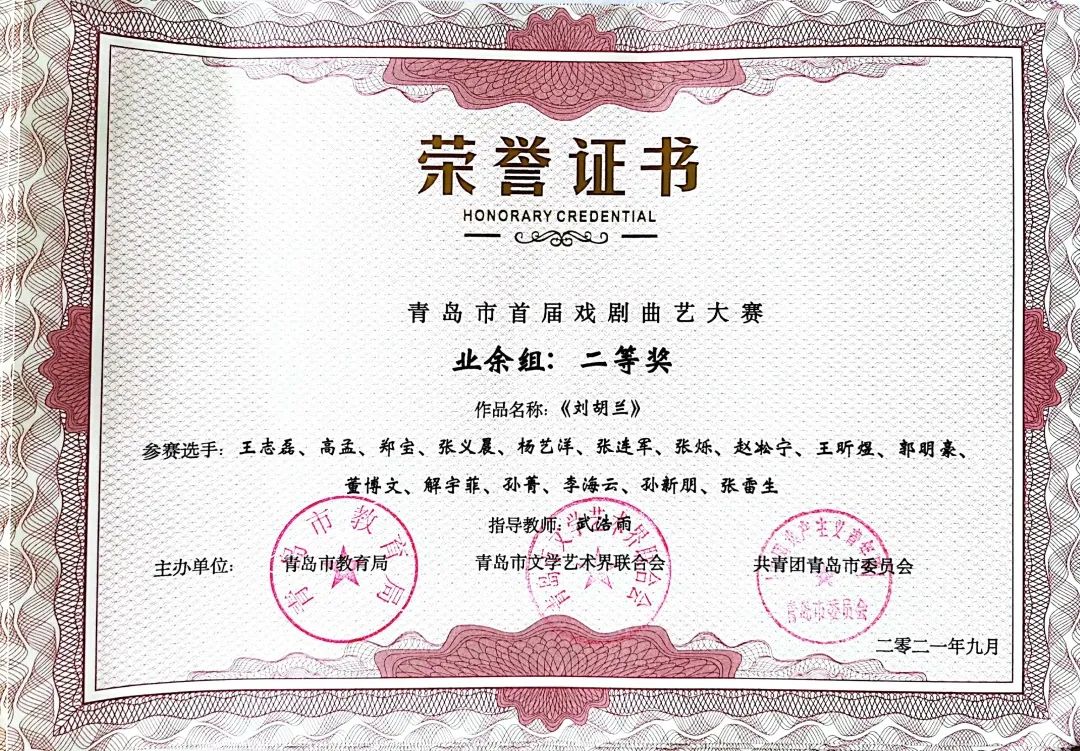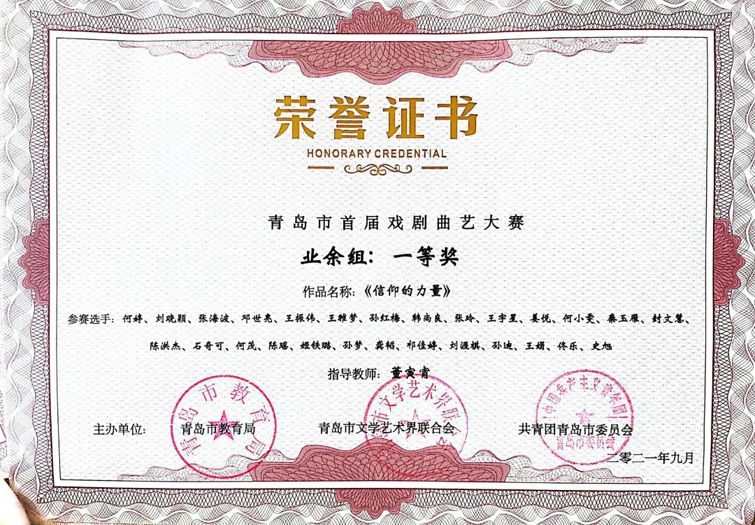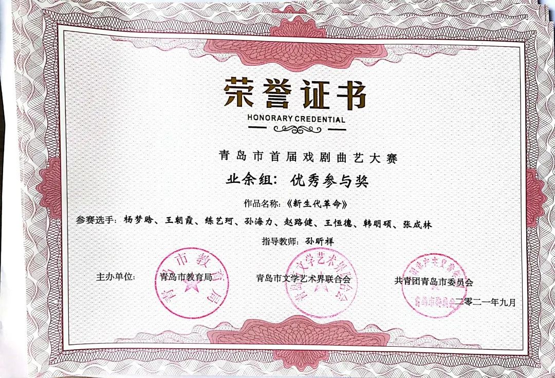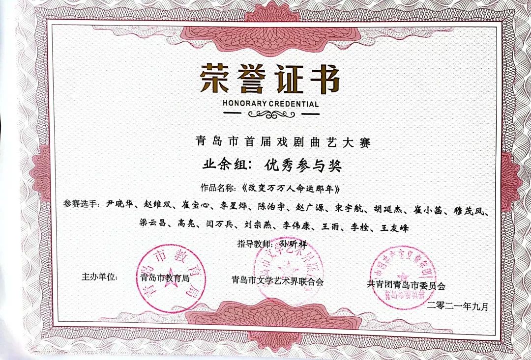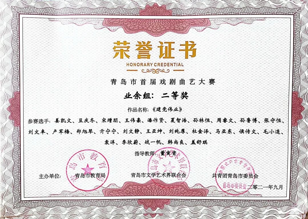 本次大赛由中共青岛市委宣传部指导,由中共青岛市委教育工作委员会、青岛市教育局、青岛市文学艺术界联合会、共青团青岛市委员会共同主办,由青岛市戏剧家协会、青岛市曲艺家协会、智慧青岛、中导映画(山东)影业有限公司联合承办的“红心永向党--青岛市首届戏剧曲艺大赛”圆满落幕。