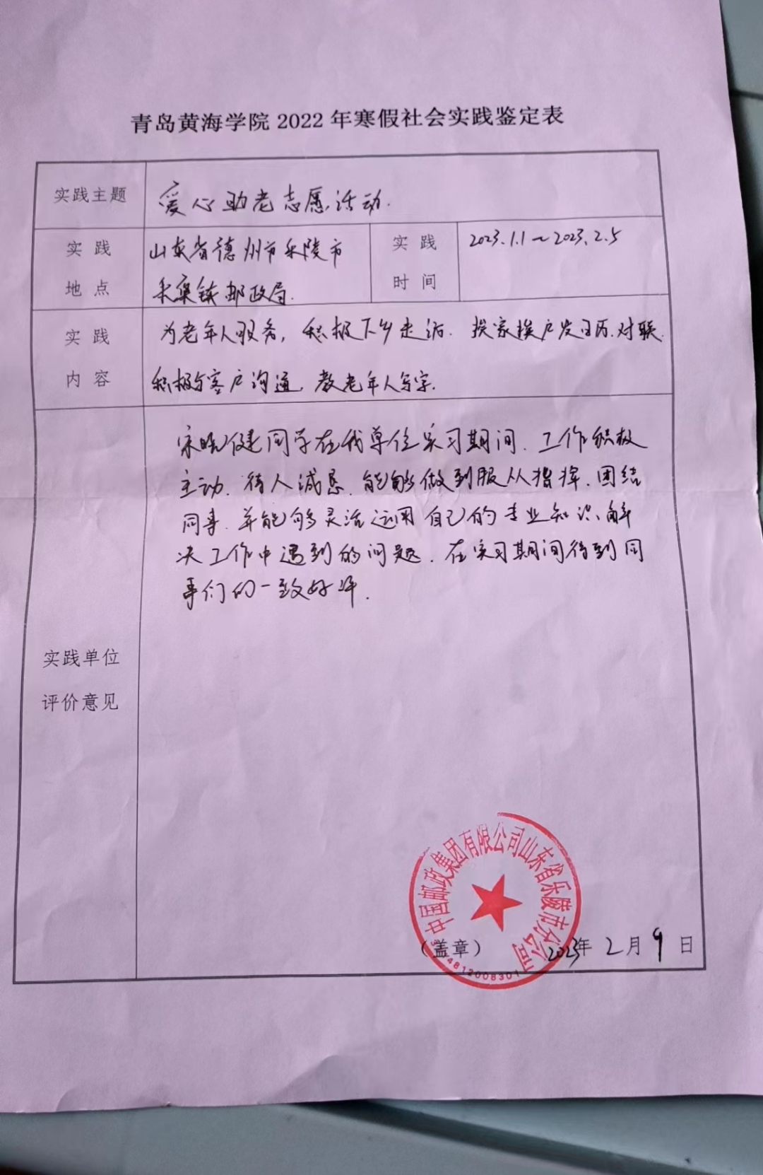 实习单位:山东省德州市乐陵市朱集镇邮政支局。