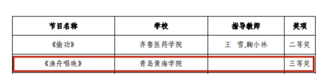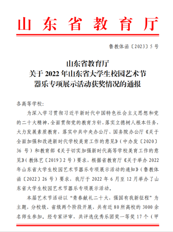 近日,山东省教育厅公布 2022 年山东省大学生校园艺术节器乐专项展示活动获奖情况,我校选送的《渔舟唱晚》荣获优秀乐团奖(甲组)三等奖。