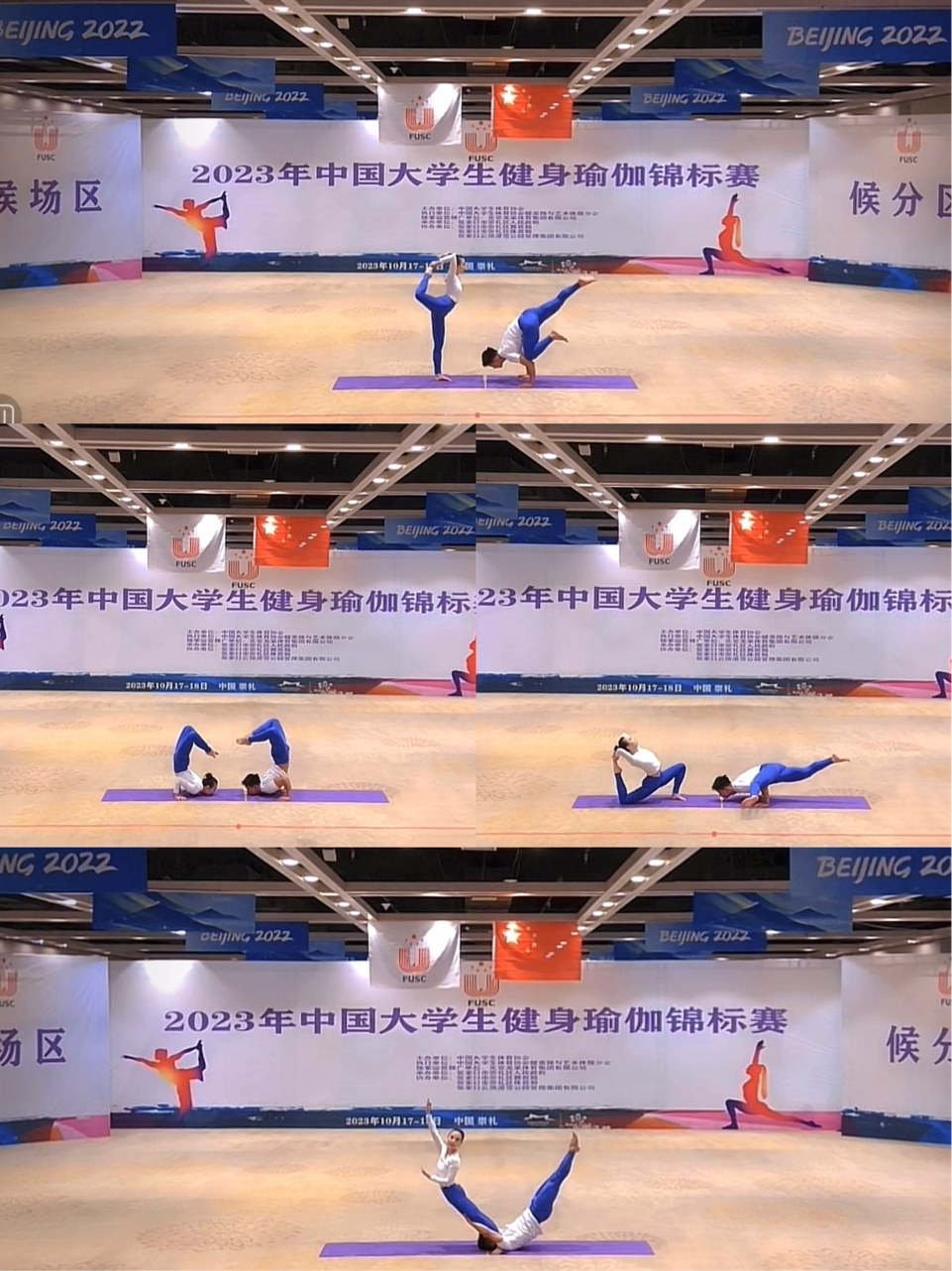 本次比赛由健身瑜伽社团16位同学参加此次比赛。最终我校学子表现出良好的体育竞赛水平,具体成绩如下:甲组(自选动作-大集体-三级)第一名,甲组(自选动作-男子双人-三级)第一名,甲组(自选动作-混合双人-三级)第三名,甲组(自选动作-女子双人-三级)第四名,甲组(规定动作-小集体-二级)第五名,甲组(自选动作-女子双人-二级)第八名;乙A组(自选动作-混合双人-三级)第一名和乙A组(规定动作-小集体-三级)第二名。