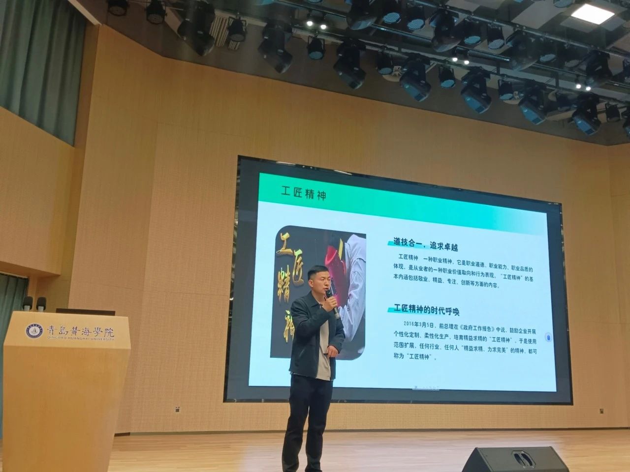 为大力弘扬劳模精神、工匠精神,展示新时代大国工匠、劳模风采,培养有理想、敢担当、能吃苦、肯奋斗的高素质应用型人才,智能制造学院于2024年4月29日在知信楼306报告厅成功举办了第三期“名师讲堂”。本次讲堂邀请到了青岛兰石重型机械设备有限公司焊接特级操作师孙靖东,他以《匠心筑梦,技能点亮人生》为题,为全院260多名师生带来了一场精彩的的专题报告。本次报告会由智能制造学院副院长齐海明主持。