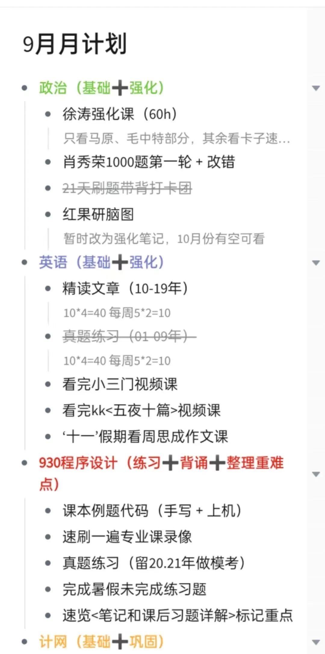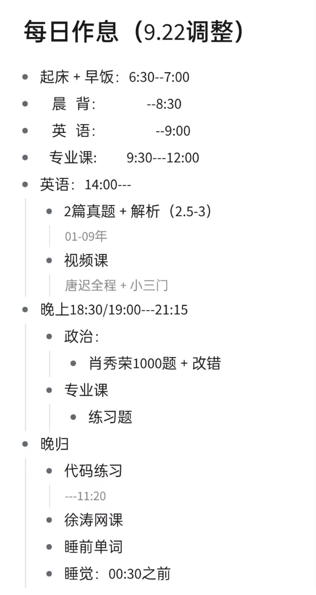 纵观他的手机备忘录,里面条理清晰的记录着自己的总体考研学习计划、日常学习计划、每日作息、计划进度等等。在日计划中,从清晨6:30到凌晨0:30,时间安排精确到小时,学习专业课、练代码,背诵英语单词、练习英语真题,看政治网课......考研涉及的每一个科目都被安排的明明白白。