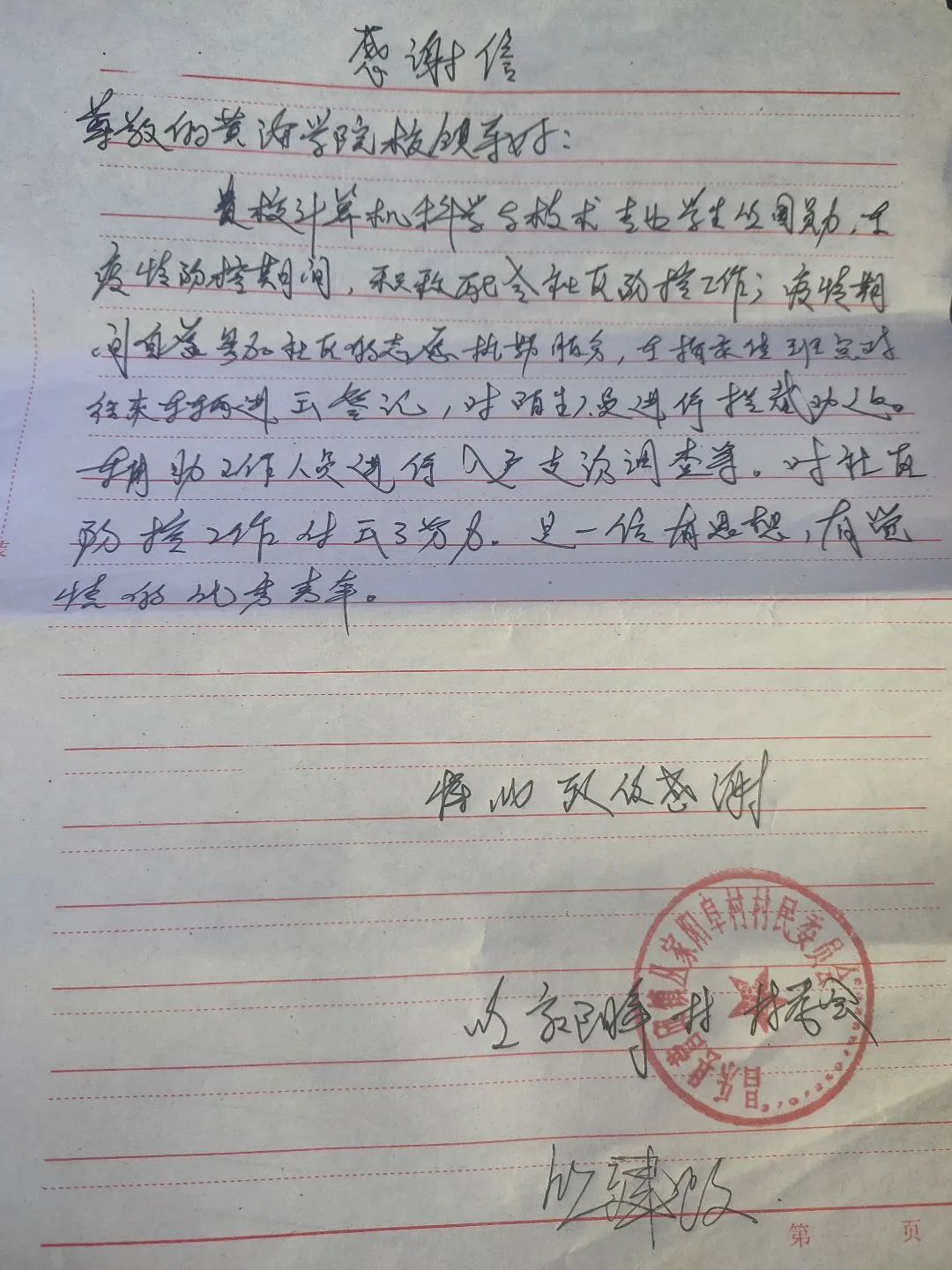 除了分享考研经验,大学期间,丛国勋还积极参加学校组织的各项志愿服务活动。2022年1月疫情期间,还在放寒假的他,在家乡边值勤,边学习,还免费给村里的小孩提供作业和课程辅导。他的家乡昌乐县营邱镇丛家阳阜村村委会还专门手写了感谢信寄到学校。