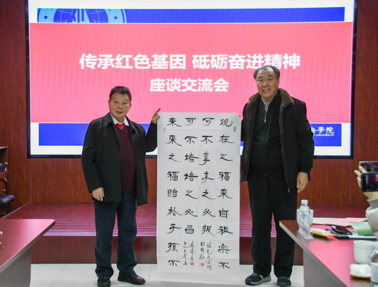 会议最后,宋庆泽主任向吴连登先生赠送书法作品,内容表达了对革命先烈的敬仰、对新时代青年的期待,以及对红色精神薪火相传的信念。他呼吁大家要铭记历史,感恩革命先烈,同时注重后代的培养,确保红色基因代代相传。